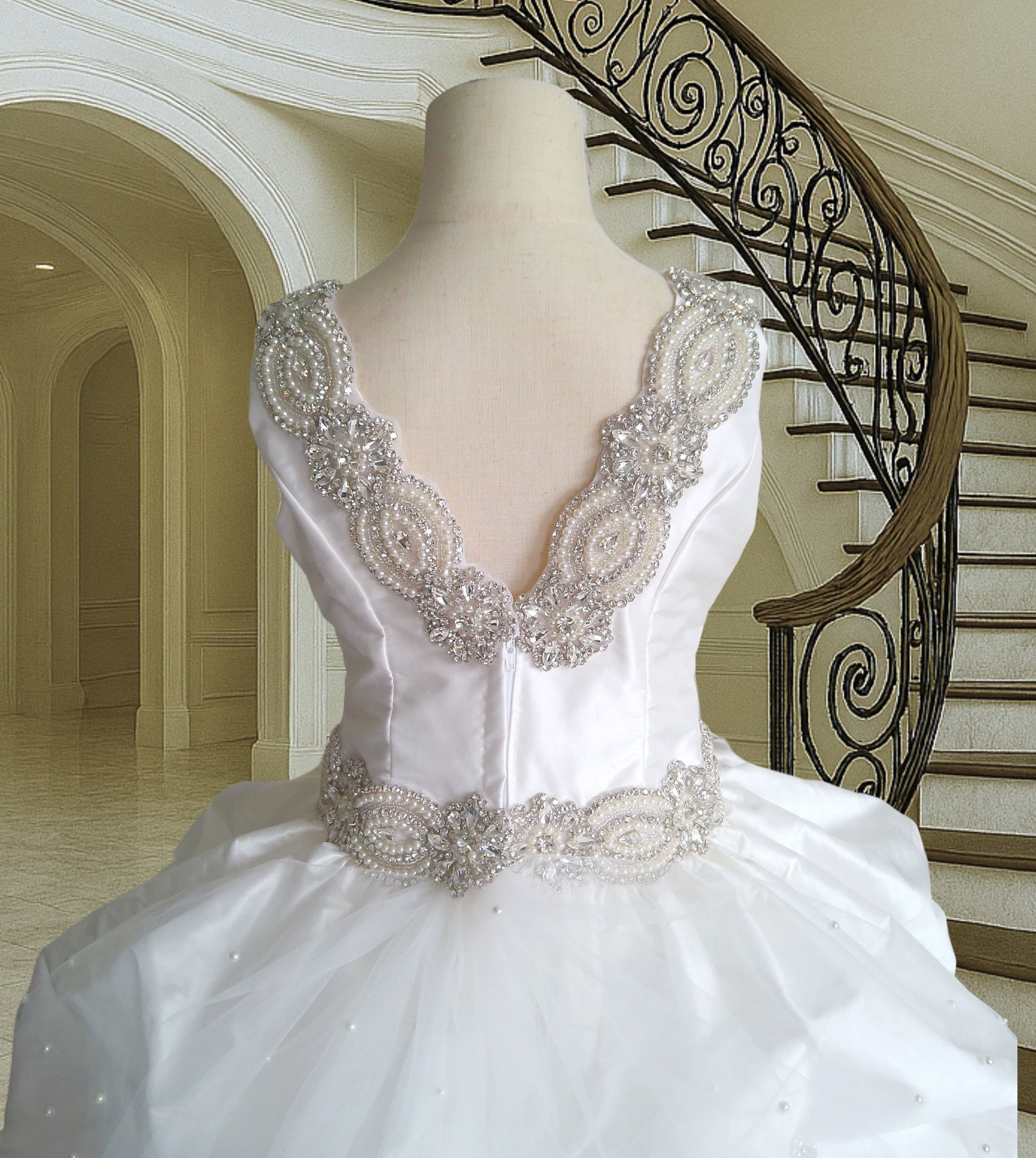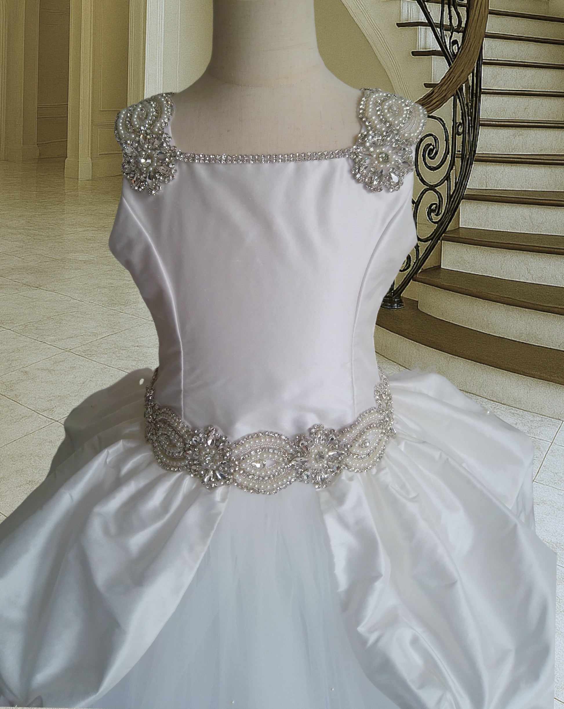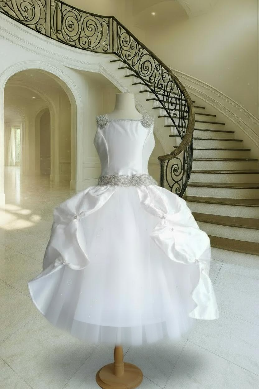 A gown made for grand entrances, the Camryn Communion Dress delivers opulence and elegance in one stunning design. The sleeveless silk bodice is accented by sparkling crystal appliqués on each shoulder and a matching, intricately beaded waistband. The full-length skirt features luxe silk gathered into dramatic side pickups, finished with petite floral centers.