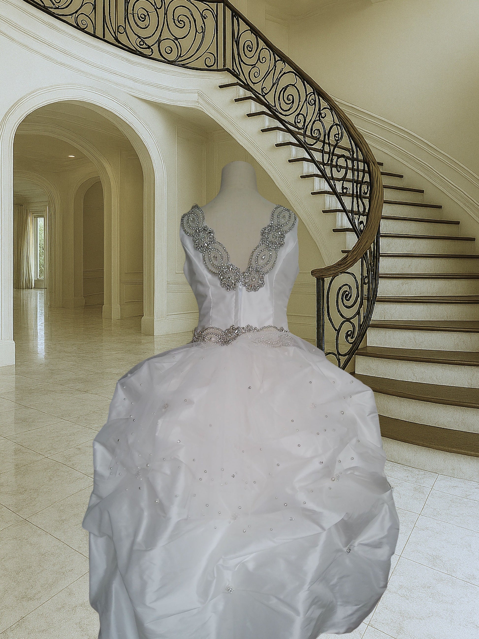 Underneath, layers of glittered tulle provide both volume and a magical shimmer. The back of the dress is just as show-stopping, with a deep-V neckline adorned in silver beading and a continuation of the pleated satin skirt. Camryn is a statement-making communion gown that’s as graceful as it is grand.