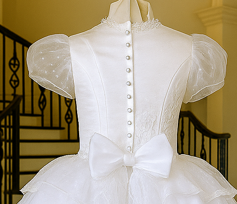The back is equally breathtaking with a row of satin-covered buttons, a large bow at the waistline, and a graceful sweep of sheer layered tulle. A high back neckline ensures modesty and elegance from every angle.